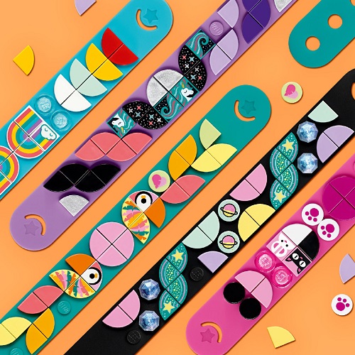 乐高®点点世界含有多款五彩缤纷的点点手环,孩子们和玩家可以发挥想象力,快速、简单、直观地拼搭出属于自己的配饰,并根据着装和心情随意变换造型。除此之外,系列中还包含彩虹首饰架、菠萝笔筒和文具盒等生活用品,用乐高®点点世界打造自己的独特创意空间。